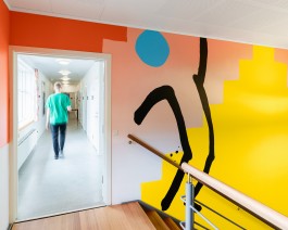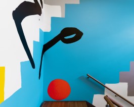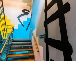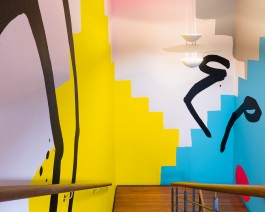 The second site-specific partner mural, "Slips and Trips", which adorns the staircase, was created especially for SOSU in Silkeborg. The abstract motif of the mural is inspired by the dynamic and essential function of the school's staircase as a place of meet and greet. "Slips and Trips" mimics the carved crooked, colourful steps and body shapes, surrounding the staircase with a humorous parallel universe of imaginary stairs. Baltes' use of deep black paint as fragmented components adds a contrast that gives the work a grace while making it seem abrupt. The work offers a playful intervention in the space and invites the viewer to bring it to life.