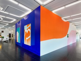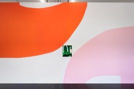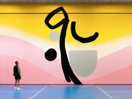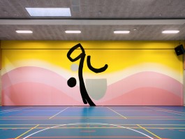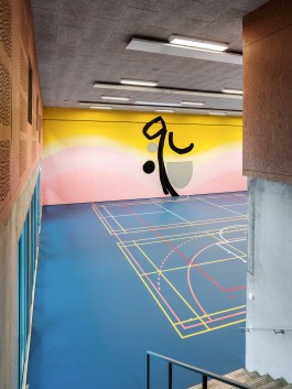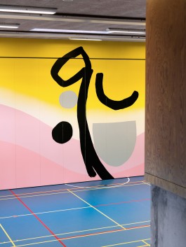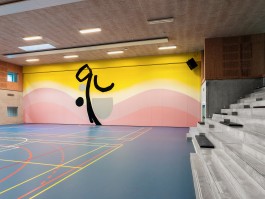 "Glen" stands as a new site-specific mural in the centre of the school's gym in Aarhus. Based on the teaching focus on bodies and physics, the artwork responds to the environment of the SOSU campus with its dynamic combination of colour gradients and warm motifs, carefully measured and executed on the large surface. The painting contributes to daily activities with a sensibility appropriate to the site. In its own way, "Glen" participates in all daily activities and contributes to the vibrancy that characterises the space, encouraging reflection on one's own movement and the way one stands, walks, runs or is simply present in the space.